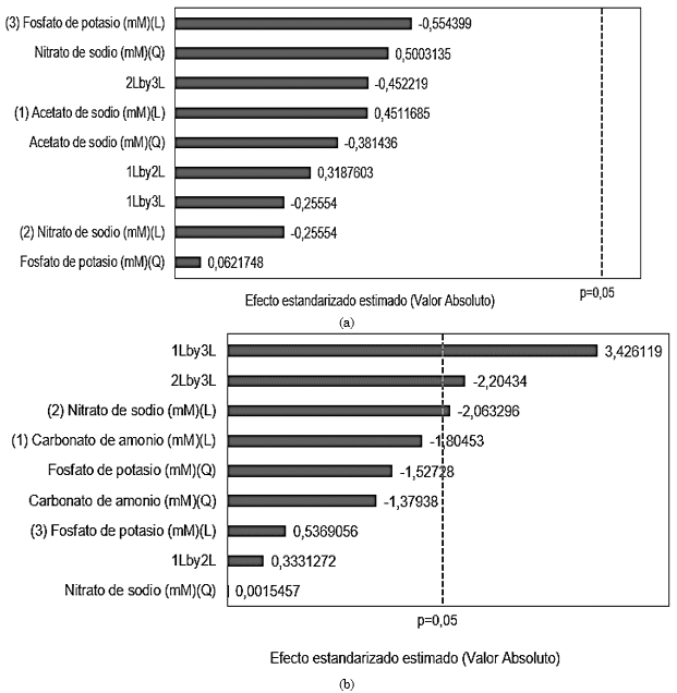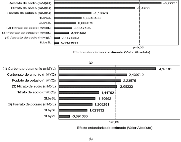 La producción de carbohidratos es mayor a la reportada por Dragone, Fernández, Abreu, Vicente, & Texeira, (2011) [17] donde el rendimiento máximo fue de 41%, empleando urea como fuente de nitrógeno para el medio de cultivo de C. vulgaris. Asimismo, el rendimiento resultó ser mayor al obtenido por Yanna, Nicolás, & Yi, (2009) [18], quienes reportaron un porcentaje de carbohidratos del 44% empleando glucosa al 1% en el medio como fuente de carbono. En la Fig. 2 (a) se observa que la única variable que tiene influencia significativa (p=0,05) es el acetato de sodio, el cual afecta inversamente proporcional (-3.27211) la producción de carbohidratos, es decir, que a menor concentración de acetato (<30 mM), la producción de carbohidratos se hace mayor, obteniendo concentraciones de hasta 1 g/L.