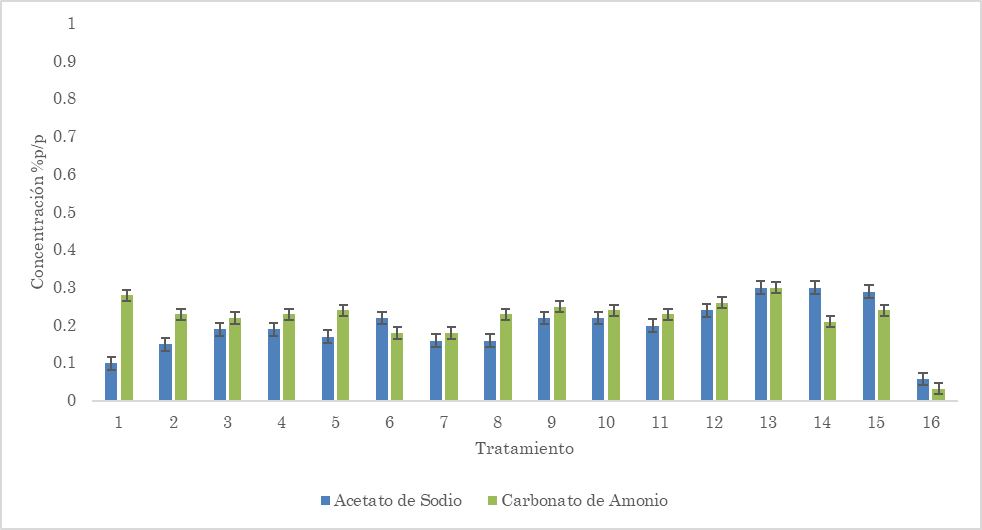 En la Tabla 5 se observa que con el tratamiento T13 para el cultivo con acetato de sodio, se alcanzó la máxima concentración de lípidos (0,0081 g/L) correspondiente al 0,34% de la biomasa. Por otra parte, se observa que los tratamientos T1 y T13 con carbonato de amonio permitieron obtener los mayores contenidos de concentración de lípidos (0,0041 g/L y 0,0031 g/L, respectivamente). El bajo porcentaje obtenido para ambos casos (0,28 y 0,3%) el cual no es superior al obtenido en el cultivo sin modificar (10% p/p para el control) es atribuido a las condiciones del medio de cultivo (dos fuentes de nitrógeno, carbonato de amonio y nitrato de sodio) y a la forma en que la microalga se adapta a las condiciones de cultivo. El porcentaje de lípidos obtenido en este trabajo es bajo comparado con el obtenido por Porras & Prada, (2012) [22] (21%) en un medio de cultivo Bold Basal modificado con nitrato de sodio y acetato de sodio.