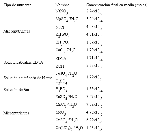 Cada litro de medio de cultivo empleado tenía la composición de macronutrientes y micronutrientes registrada en la Tabla 1.