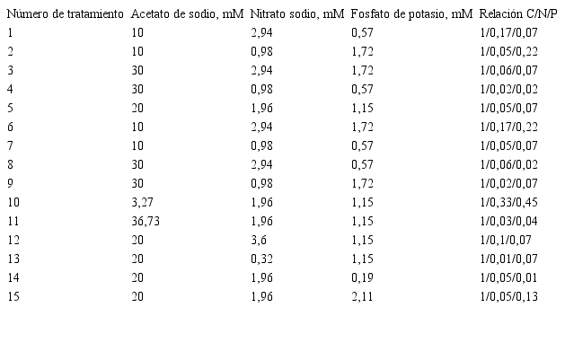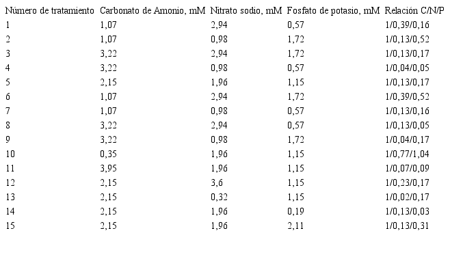 Para determinar el efecto de las variables propuestas se evaluaron 3 concentraciones de los diferentes nutrientes (Tabla 2 y 4) empleando diseño experimental de composición central no factorial 33 empleando el software STATISTICA 7.0 (StatSoft, Inc. 2004). Cada uno de los experimentos se realizó por duplicado y tuvo una duración máxima de 15 días. Como control se empleó el medio Bold Basal Modificado sin adición de carbono y con las concetraciones de nitrogeno y fosforo presente en la Tabla 1.