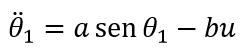 En donde las constantes a, b y c, dependen de los parámetros físicos del sistema, tales como las masas, inercias, longitudes, parámetros del motor, etc. La señal de control . se establece como un valor proporcional a la corriente aplicada al motor. No se incluye la fricción en los ejes de rotación, ya que normalmente es muy baja y puede despreciarse para simplificar el modelo. La rueda de inercia es simétrica con respecto a su eje y por tanto el valor del ángulo θ2 no tiene efecto sobre la dinámica del sistema o sus condiciones de equilibrio. Este hecho permite proponer un modelo de estados de orden tres con las variables x1= θ1 (ángulo del péndulo), x2= θ ̇1 (velocidad angular del péndulo) y x3= θ ̇2 (velocidad angular de la rueda). Al derivar estas variables y usando (1) y (2) se obtiene el modelo no lineal de estados para el péndulo con rueda de reacción: