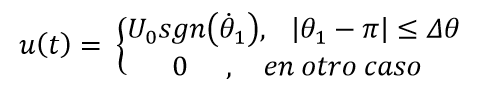 Considerando la posición inicial θ1 = π (equilibrio natural), se genera mediante simulación la trayectoria a seguir teniendo en cuenta que es posible hacer oscilar, el péndulo con una amplitud creciente si se aplica una señal de control constante y cuyo signo depende de la velocidad de la barra [14]. Esta entrada se aplica al sistema en una vecindad de tamaño ajustable Δθ alrededor del ángulo inicial. La entrada de control que permite dicha oscilación, según la descripción anterior, tiene la expresión (22):