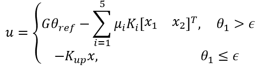 El ángulo ϵ debe ser menor a 5° con el fin de evitar cambios bruscos en la señal de control en el instante de conmutación. Para el regulador Kup se definieron los polos de lazo cerrado s1,2=-4 ± j4,1 y s3= -11,4. Con estos polos y el modelo linealizado alrededor de x1 = θ1=0 se obtuvo el vector de ganancias presentado en (25)