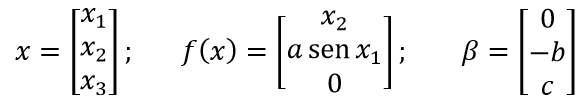 Cuando un sistema admite este tipo de modelo se dice que es lineal en el control o “afín” [12], [13]. En (6), . es el vector de estados, f(x) es una función no lineal de . (debido al término senx1) y β. un vector constante. Entonces:
