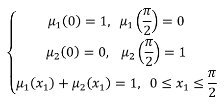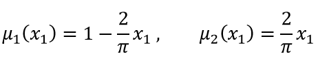 Para obtener una aproximación difusa de z(x1) con las rectas L1 y L2, se definen las etiquetas “x1 es cercano a cero” y “x1 es cercano a π/2 ” con funciones de pertenencia μ1 (x1) y μ2 (x1) respectivamente, las cuales deben cumplir las condiciones que se establecen en: