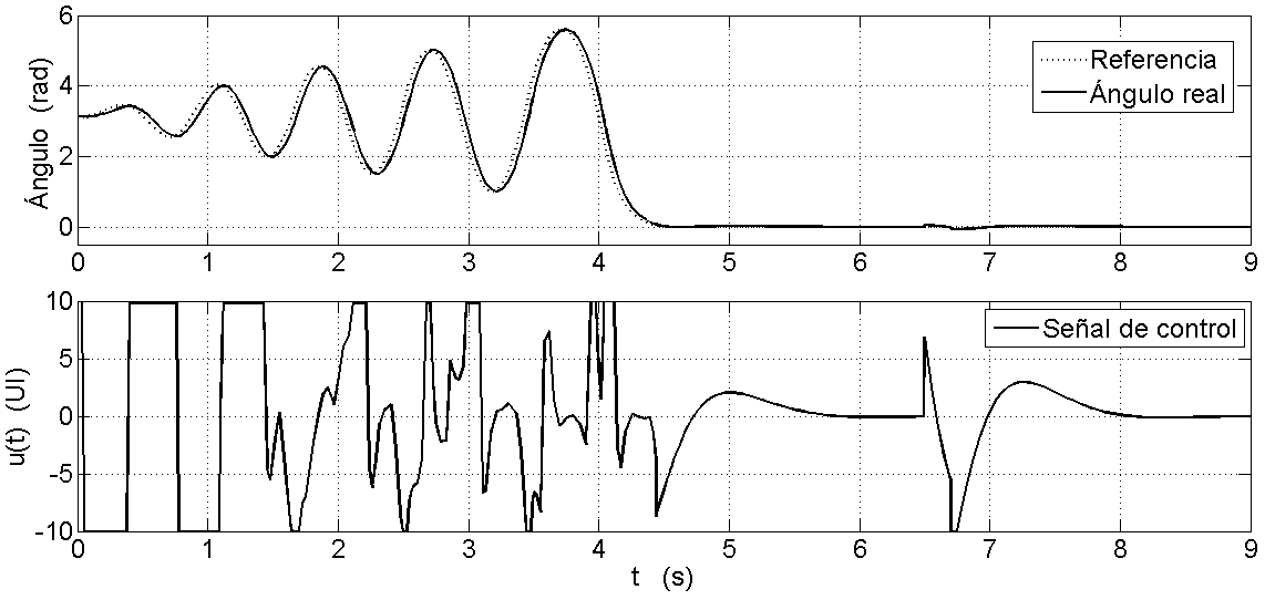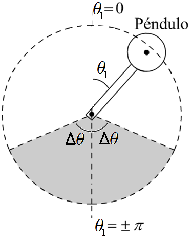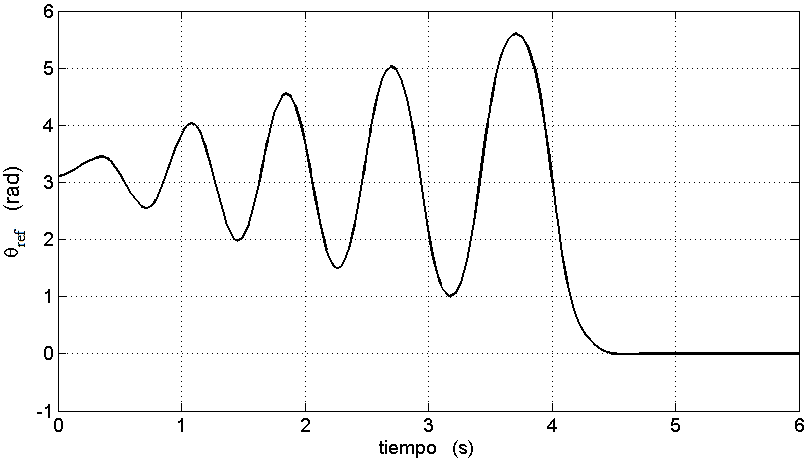 Siendo U0 una constante menor al máximo valor posible de la señal de control y y sgn(⋅) la función signo. Ajustando el tamaño Δθ de la zona de aplicación de la entrada (π-Δθ ≤ θ ≤ π+ Δθ), que se presenta sombreada en la Fig. 6, se puede variar el tiempo que el péndulo tarda en alcanzar la posición invertida (zonas más amplias reducen el tiempo de subida). Este proceso es necesario ya que para lograr una subida directa se requieren valores muy elevados de la señal de control. Cuando el péndulo llega a puntos suficientemente cercanos al equilibrio inestable, un controlador (regulador) lineal se encarga de llevar al sistema hasta esa posición (x1=0) y mantenerlo allí, regulando pequeñas perturbaciones. En la Fig. 7 se presenta la trayectoria de referencia obtenida.