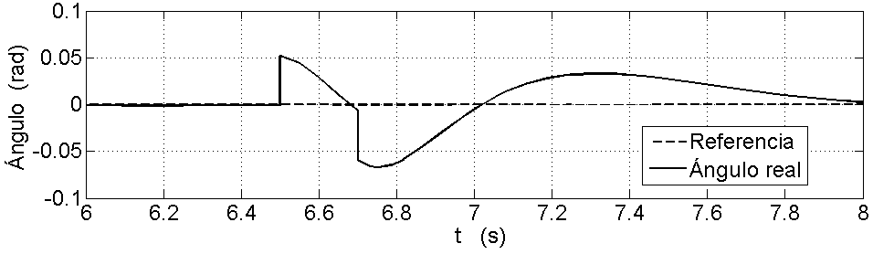 En la Fig. 9 se muestran los resultados de simulación. Se observa que hay saturación en la señal de control, pero aun así se logra el seguimiento de la referencia con un grado de desfase aceptable. Debido a dicha saturación, resulta muy difícil reducir el tiempo de subida a un valor menor al obtenido (tup ≈ 4,5 s). Se incluye el efecto de una perturbación de tres grados (3°) en el ángulo del péndulo aplicada durante Δt=0,2 s en el instante t=6,5 s. Se observa cómo el regulador elimina dicha desviación. En la Fig. 10 se presenta en detalle el efecto sobre la variable de estado x1 debida a la perturbación. Finalmente, la velocidad angular de la rueda se presenta en la Fig. 11.
