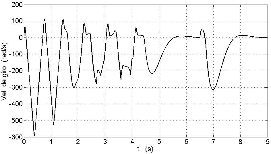 Se realizaron simulaciones en el dominio de tiempo, con el fin de validar la efectividad del controlador sobre el sistema no lineal estudiado. El esquema de control descrito anteriormente es simulado en el entorno Matlab, asignando a los coeficientes a, b y . los valores correspondientes a los parámetros físicos del sistema de prueba presentado en [3] (Mechatronics Control Kit). Dichos valores son: a=78,4 rad/s.. b=1,08 rad/s.; c=198 rad/s2. La señal de control se debe limitar al rango normalizado -10 ≤ u ≤ 10 UI (unidades de ingeniería), que luego de la etapa de amplificación corresponde al rango de voltajes aplicado al motor.