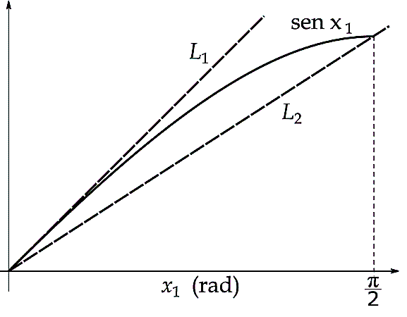 En este trabajo se usa el enfoque alternativo propuesto en [9], en el cual el hiperplano usado pasa por el punto de operación deseado y por el origen, con base en el sector que ocupan las no linealidades del modelo. Como ilustración, considere la función z(x1)=senx1 en 0 ≤ x1 ≤ π/2. Tomando las rectas L1 (x1 )=x1 (que es tangente a z(x1 ) en el origen), y L2 (x1 )= 2x1/π (que pasa por el origen y el punto ( π/2, 1), se puede comprobar, como lo ilustra la Fig. 2, que en el intervalo establecido se cumple la desigualdad: