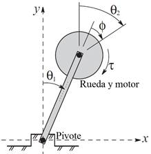 El péndulo con rueda de reacción consta de una barra que puede girar libremente alrededor del punto de apoyo (pivote) en uno de sus extremos, como se muestra en la Fig. 1. El motor acoplado al extremo opuesto del pivote actúa sobre una rueda de inercia con la cual se controlan las oscilaciones de la barra, debido al torque de reacción. El ángulo θ. del péndulo (respecto a la vertical) y el ángulo ϕ entre el péndulo y la rueda se miden con sensores ubicados en ambos ejes de giro. La rueda de inercia forma con la vertical un ángulo (absoluto) θ. que se obtiene como θ.=ϕ+θ.. El torque . se obtiene de la acción directa del motor sobre la rueda.
