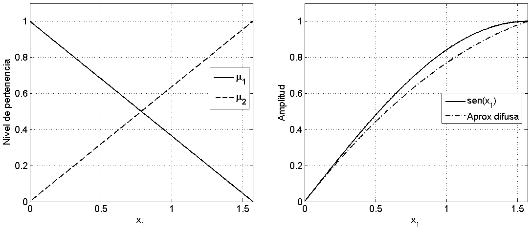 En la Fig. 3 se presentan las funciones de pertenencia (x1 ) y μ2 (x1) definidas en (13), así como la comparación entre la función senx. y la aproximación propuesta en (15). Aunque el nivel de aproximación es aceptable, es posible mejorarlo definiendo rectas y funciones de pertenencia intermedias en el rango de trabajo 0 ≤ x1 ≤ π/2.