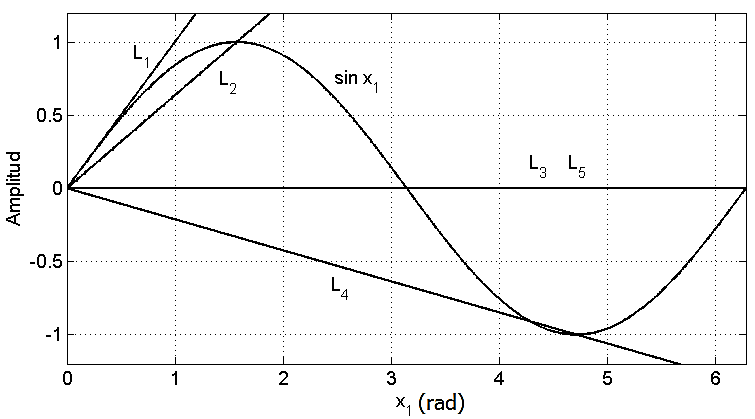 El enfoque de seguimiento de trayectoria que se propone más adelante, requiere un rango amplio de operación ( 0 ≤ x1 ≤ 2π o incluso ángulos negativos), por lo cual se aplica el método de linealización descrito en los ángulos cuadrantales, es decir, en los valores x0.=0, π/2, π, 3π/2, 2π. Alrededor de cada ángulo, la función seno se aproxima por una recta que pasa por (0,0) y el punto(x01, senx01). En x01=0 se usa la recta tangente y la aproximación general se obtiene con la combinación difusa de las anteriores. La Fig. 4 presenta la función seno y las rectas de aproximación en el rango 0 ≤ x1 ≤ 2π. Las ecuaciones de dichas rectas se especifican como: