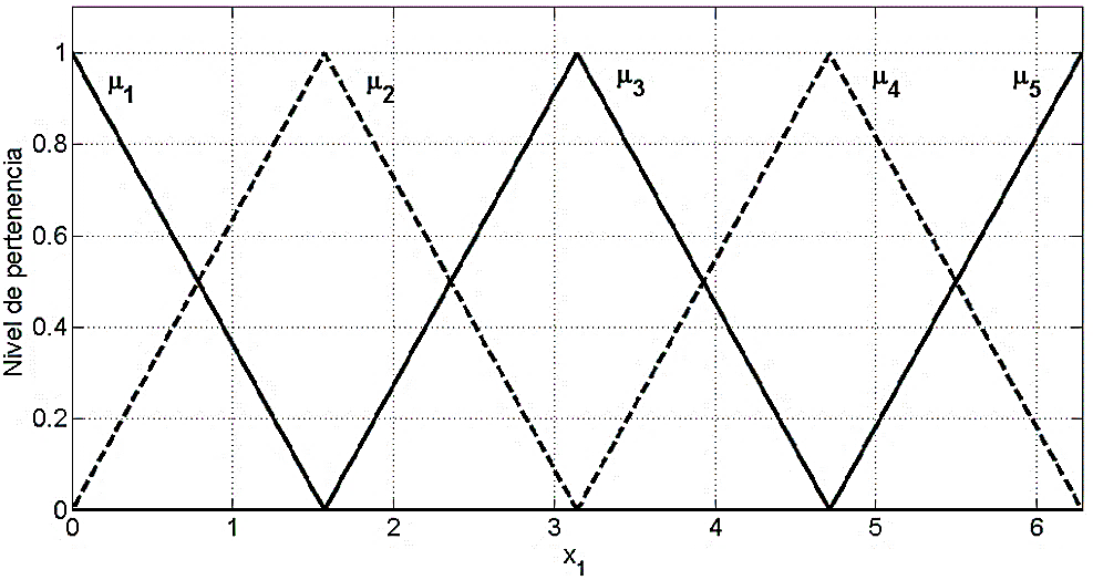 Las funciones μi (x1) usadas tienen forma triangular simétrica, como se ilustra en la Fig. 5, con base Δx1=π y están centradas en los diferentes puntos de linealización, μ1 y μ5 son solo mitades de triángulo por estar en los extremos del intervalo de trabajo 0 ≤ x1 ≤ 2π.
