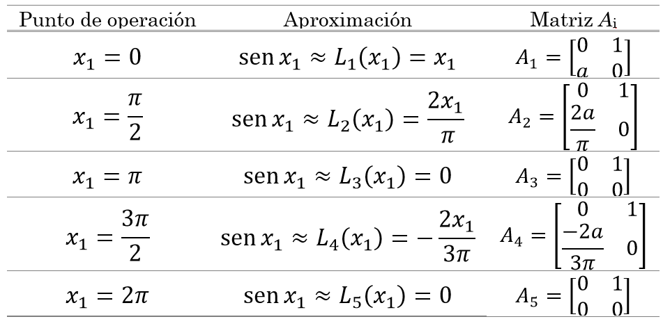 El vector β1 = [ (0 - b)]Tes común a todos los modelos, las matrices Ai asociadas a los puntos de operación se presentan en la Tabla 1, donde también se especifican las aproximaciones correspondientes a la no linealidad.