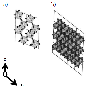 Por otro lado, la fase β-Ta2O5 es una modificación de la fase L-Ta2O5 a bajas temperaturas sin vacancias de oxígeno, descrita por una estructura ortorrómbica con 14 átomos en la celda convencional. En nuestro cálculo, hemos tomado como referencia la estructura cristalina propuesta por Ramprasad para describir esta fase [7]. En la Fig. 2-(a), mostramos la estructura cristalina de este modelo, donde se tienen cadenas de bipirámides pentagonales TaO7 que comparten los lados con octaedros TaO6. En la Tabla 3, presentamos la información cristalográfica más relevante para esta fase. Es importante mencionar en este punto que en nuestro cálculo durante la relajación, la estructura ortorrómbica original experimentó una pequeña distorsión a una estructura monoclínica simple, donde el ángulo 𝛾 se alejó levemente de 90°, tal como fue reportado en un trabajo teórico anterior [4] (en este caso, β- Ta2O5 adquiere una simetría puntual ).