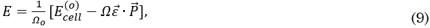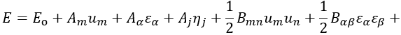 Para determinar las anteriores funciones respuesta, consideremos primero la situación donde no se permiten desplazamientos atómicos internos. Aquí, podemos definir estas funciones respuesta como la segunda derivada de la energía con respecto a las perturbaciones, es decir, respecto a los desplazamientos atómicos, a la tensión, al campo eléctrico aplicado o a las derivadas mixtas de dos de estas perturbaciones. En este caso, el funcional de energía puede ser definida de acuerdo a (9), donde es la energía del estado base y Ω representa el volumen de la celda deformada. Ahora, vamos a expandir el funcional dado por (9) en una serie de Taylor alrededor de la posición de equilibrio como se observa en (10), en esta ecuación los coeficientes de primer orden 𝐴𝑚, 𝐴𝛼 y 𝐴𝑗 son asociados con la fuerza por unidad de volumen (–𝐹𝑚/ Ωo), la polarización eléctrica ( -𝑃𝛼) y con el esfuerzo (𝜎𝑗), respectivamente.