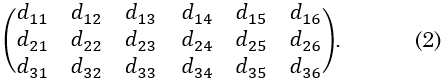donde la polarización eléctrica 𝑃𝑖 y el campo eléctrico 𝐸𝑘 son tensores de rango 1, la tensión 𝜎𝑗𝑘 y la deformación 𝑋𝑖𝑗 son tensores de rango 2 y el tensor piezoeléctrico 𝑑𝑖𝑗𝑘, es un tensor de rango 3 (aquí estamos utilizando la convención de Einstein, donde se tiene una suma sobre índices repetidos). Debido a que el tensor de tensiones 𝜎𝑗𝑘 es un tensor simétrico, entonces las 27 componentes del tensor piezoeléctrico pueden reducirse a 18 componentes independientes. En forma matricial, el tensor piezoeléctrico puede escribirse entonces de la siguiente manera:
