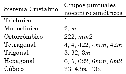 De los 32 grupos puntuales, únicamente los grupos no-centro simétricos presentan piezoelectricidad. En la Tabla 1, se presenta una lista de los sistemas cristalinos y sus respectivos grupos puntuales no-centro simétricos que pueden presentar piezoelectricidad.