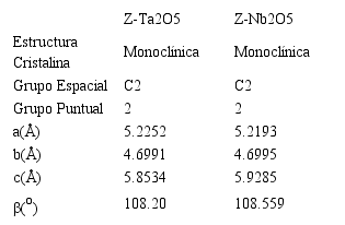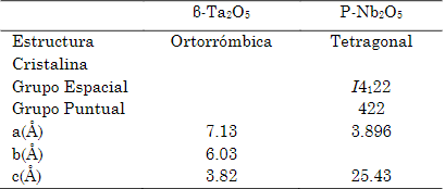 Tabla 3. Información cristalográfica de β-Ta.O. y P-Nb.O.. Fuente: [3], [7].