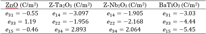 De (18) y (19), se puede observar que estas fases poseen una muy buena respuesta piezoeléctrica y al ser comparadas indirectamente con ZnO, observamos que algunos coeficientes piezoeléctricos de Z- Ta2O5 y Z- Nb2O5 son el doble o incluso más grandes que los valores para ZnO, como pueden ser evidenciado en la Tabla 4. En esta misma tabla, mostramos una comparación con uno de los mejores piezoeléctricos reportados en la literatura, BaTiO3. De esta comparación, podemos observar que los coeficientes piezoeléctricos de la fase Z en ambos compuestos se encuentran en una región intermedia entre los coeficientes para ZnO y BaTiO3, evidenciando claramente la notable respuesta piezoeléctrica de Ta2O5 y Nb2O5 en su fase Z y perfilándolos como grandes candidatos para aplicaciones en el ámbito tecnológico e industrial donde la piezoelectricidad sea un fenómeno requerido.