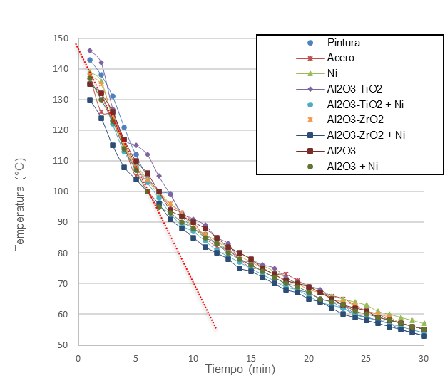 El análisis de la temperatura exterior de las tuberías puede observarse en la Fig. 11. Es evidente que durante los primeros minutos del ensayo la temperatura incrementa hasta alcanzar un pico de temperatura máxima a los cinco minutos, lo cual es asociado a la transferencia de calor predominantemente conductiva desde la pared interior a la exterior de la muestra, el cual es diferente para cada sistema de recubrimiento.