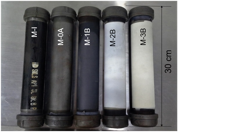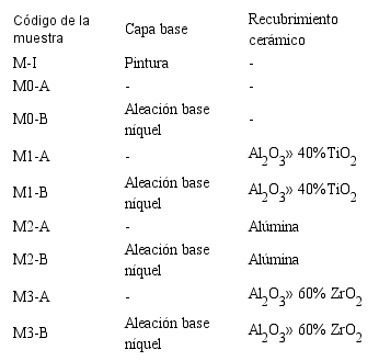 Para la elaboración de los sistemas de aislamiento térmico se utilizaron polvos cerámicos comerciales de Al.O. referencia Sultzer-Metco™ 105 SFP, de Al.O.»40% en peso de TiO. referencia Saint Gobain 108™, y Al.O.»60% en peso de ZrO. referencia Eutectic Castolin™ 25088. Para la capa base se utilizó el polvo comercial Eutectic Castolin™ CPM 1205, correspondiente a una aleación de níquel con aproximadamente 1,8% en peso de silicio. Los sistemas de recubrimiento depositados son descritos en Tabla (2). Los tubos de acero al carbono utilizados como sustrato fueron recibidos con una pintura orgánica de color negro en la superficie externa, la cual fue codificada como (M-I) y evaluada de la misma forma que los recubrimientos depositados mediante proyección térmica. La muestra M-0 corresponde a la tubería sin recubrimiento alguno en la superficie.