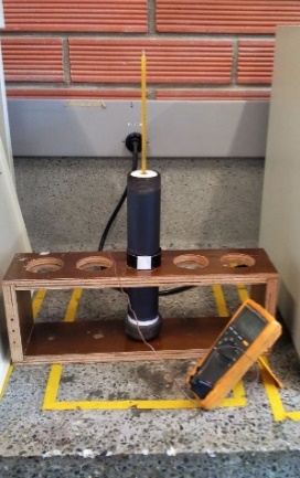 Para evaluar la capacidad de aislamiento de los sistemas planteados, se introdujo en cada probeta tubular aceite de silicona calentado a una temperatura de 160 °C y se midió la variación de la temperatura tanto del aceite, como de la superficie exterior del tubo a intervalos de un minuto durante media hora. La temperatura del aceite fue medida con un termómetro, mientras que la temperatura exterior del tubo fue medida con una termocupla acoplada a un multímetro digital marca Fluke referencia 179, los dos previamente calibrados y con una sensibilidad de 1ºC. Ver Fig. 2. La temperatura del aceite de silicona fue medida en el centro de la zona que fue llenada con este fluido, y la de la tubería fue medida a la misma altura en que se realizó la medida del aceite de silicona, pero sobre la pared externa del tubo. Para reducir las pérdidas de calor y evitar la fuga del aceite de silicona, se sellaron los extremos de cada tubo hasta donde fueron llenados con el fluido, utilizando tapones de teflón, uno de los cuales permite la inserción del termómetro. A la prueba se realizó un duplicado evidenciando una buena reproducibilidad.