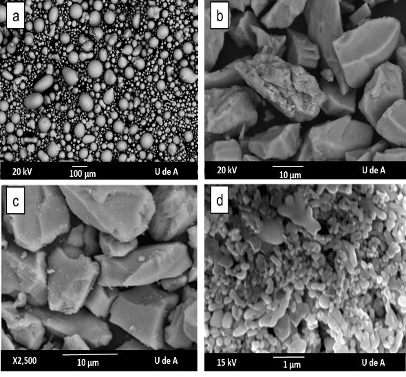 Por su parte, el análisis morfológico de las partículas indicó que los polvos de la aleación de níquel y de la mezcla cerámica de Al.O.»60% en peso de ZrO. poseen alta esfericidad, mientras que aquellos de alúmina y de Al.O.»40% en peso de TiO. son de morfología irregular y con aristas agudas que son características del proceso de molienda al que son sometidos para ajustar su tamaño. Además se evidenció que los polvos de Al.O.»60% en peso de ZrO. están constituidos por múltiples partículas de orden nanométrico y submicrométrico que generalmente son aglomeradas por procesos como el de secado por aspersión (en inglés Spray Drying).