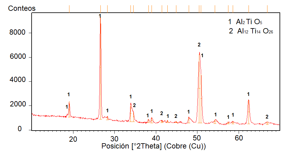 A partir del espectro de la Fig. 4 correspondiente al recubrimiento de Al.O.-TiO., se pudo determinar que las fases cristalinas que constituyen este recubrimiento son los titanatos de aluminio (Al.TiO.) marcados como 1 en el espectro (Código de referencia ICDD 01-070-1434) y los tridecaóxido dititanio de hexaaluminio (Al12Ti.O26) marcados como 2 (Código de referencia COD 96-201-4755). Ambas son fases ortorrómbicas caracterizadas por su baja conductividad térmica (k=1.5 W/mK) [14], resistencia a los choques térmicos y muy bajos coeficientes de dilatación térmica, lo que le da estabilidad en temperaturas de hasta 750°C, donde empiezan a descomponerse cuando no están dopados [18].