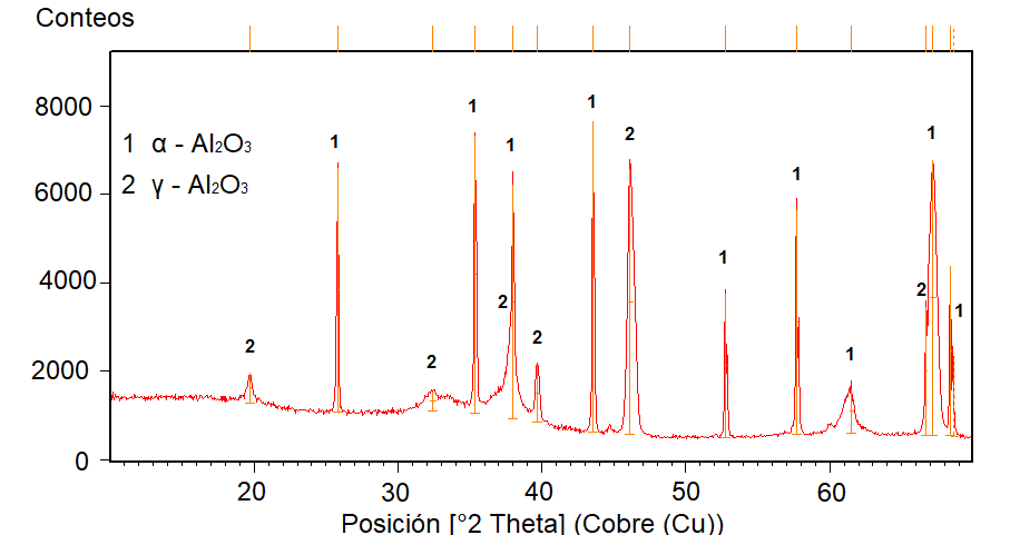 El espectro de la Fig.5 corresponde al recubrimiento de alúmina, en el cual se identifica a la Al.O.-α marcada como 1 (Código de referencia COD 96-900-9684) y la Al.O.-γ marcada como 2 (Código de referencia ICDD 00-029-0063 e ICDD 00-004-0858), como las fases cristalinas que lo constituyen. En recubrimientos elaborados mediante proyección térmica la Al.O.-α está asociada a una fase remanente que estaba presente en los polvos de partida y que no se transforma durante la proyección térmica, cuando las partículas de alúmina se funden solo en la superficie y su núcleo permanece sólido y sin mayores transformaciones de las fases. Generalmente la estructura de los recubrimientos con partículas parcialmente fundidas tiene alta porosidad, lo cual es favorable para el caso de aislamientos térmicos. Por su parte, la Al.O.-γ es una fase meta estable producida a partir de la solidificación rápida de partículas fundidas de alúmina. Esta fase, por encima de 700°C puede sufrir transformaciones a Al.O.-α pasando previamente por una fase delta [20].