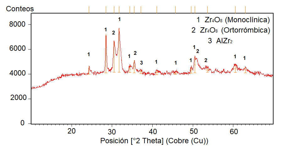 De otro lado, en la muestra M3-B se identificaron los picos asociados al óxido de zirconio monoclínico (Zr.O.) o Baddeleyita (Código de referencia COD 96-900-5834), marcados como 1, y al ortorrómbico con el mismo nombre marcados como 2 (Código de referencia COD 96-900-5836). Algo característico observado en este análisis fue que los patrones utilizados para identificar las respectivas fases que mostraban un mejor ajuste en cuanto al ángulo adecuado en los picos más intensos, presentaban ligeros corrimientos hacia la izquierda del espectro. Estos corrimientos pueden asociarse a deformaciones que modifican las orientaciones de crecimiento de los cristales, causadas por esfuerzos compresivos generados en la intercara del cerámico con el sustrato o capa base durante la solidificación, y esfuerzos de tensión en la superficie generados también por la contracción térmica durante la solidificación. Una tercera fase marcada como 3, corresponde a aluminatos de zirconio (AlZr.) (Código de referencia ICDD 00-48-1378).