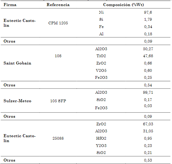 En la tabla el ítem “otros” corresponde a óxidos detectados en cada material de partida en cantidades inferiores a 0,1 % en peso. De acuerdo con la tabla anterior, se pudo establecer que los polvos seleccionados son acordes en composición química a lo especificado por el fabricante.