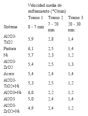 Finalmente, la muestra que alcanza la menor temperatura en la cara externa del tubo es la recubierta con la capa cerámica de Al.O.»40 % en peso de TiO. con capa base de aleación de níquel (muestra M1-B), seguida de la del recubrimiento de Al.O.»60 % en peso de ZrO. depositada sobre una capa base de níquel. Este comportamiento se asocia a la menor conductividad térmica de estos dos cerámicos (1,5 y 21,6 W/m-K [1] respectivamente) y que la capa base de aleación de níquel, a pesar de presentar una alta transferencia de calor se comporta como una barrera que puede reducir ligeramente la temperatura proveniente de la pared interna de tubo de acero al carbono en su paso hacia el recubrimiento cerámico.