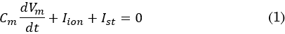 Where Cm is the membrane capacitance (100 pF), Iion is the total membrane current and Ist is the external stimulus current. The model is considered under normal electrophysiological conditions.