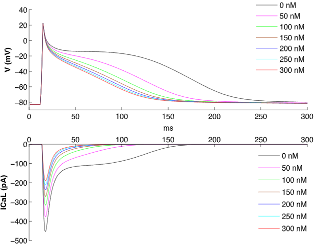 Where gCaL is the maximum conductance of ICaL, d is the activation gate, f is the voltage-dependent inactivation gate, fCa is the calcium-dependent inactivation gate and 65 is the value of equilibrium potential for ICaL.