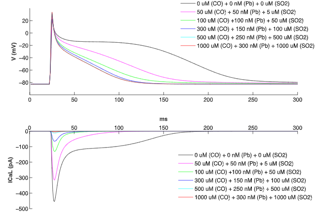 Exposure to these air pollutants contributes to cardiovascular diseases [6]. Epidemiological studies have reported effects such as heart failure, generation of cardiac arrhythmias and decreased heart rate variability [3-13]. Experimental studies have shown that Pb++ blocks L-type calcium channels [14]. A decrease in L-type calcium current (ICaL) is an important mechanism that favors the generation of atrial arrhythmias [15]. Recently, it has been shown that chronic exposure to CO promotes a pathological phenotype of cardiomyocytes in which remodeling and intracellular Ca++ overload increase the risk of arrhythmias [10, 12] and ischemia [16]. On the other hand, experimental studies suggest that exposure to SO2 produces an effect on the ICaL current that can produce damage in cardiomyocytes, which in turn results in hypoxia and ischemia [17, 18]. The objective of this work is to study, through computer simulation, the electrophysiological effects of Pb++, CO and SO2 at different concentrations on ICaL and action potential handset under normal electrophysiological conditions.