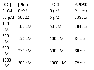 Table 4 shows the APD90 decreasing values in function of the different concentration of the three air pollutants. CO, Pb++ and SO2 concentrations increases generate an APD shortening.