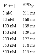 Table 2 shows the APD90 decreasing values as a function of the different Pb++ concentrations. The increase in Pb++ concentration generated an APD shortening.