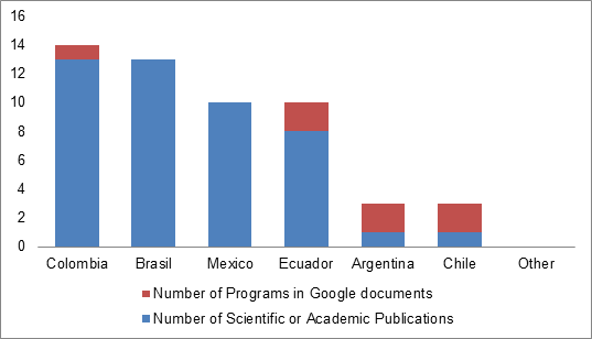 An overview of our obtained results from both scientific literature and telerehabilitation projects/programs searches are shown in Figure 1. A group of 802 articles and 255 Google documents were initially retrieved by the aforementioned searches. Out of those, only 46 relevant articles and 7 documents related to programs and projects met all the inclusion criteria proposed in this systematic review. A distribution of the selected scientific papers and projects by Latin American region is shown in Figure 2. It reveals that only six countries have reported any telerehabilitation initiative based on emerging technologies for restoring some motor impairments. As a result, a total of 14 documents were found from Colombia, 13 from Brazil, 10 from Ecuador and 10 from Mexico. Argentina and Chile reported 3 documents each. Additionally, in the particular case of Chile, a set of 8 documents related to telerehabilitation projects developed by Teletón Institute was retrieved. However, those initiatives were summarized and reported in a single relevant document, which is considered in this systematic review.