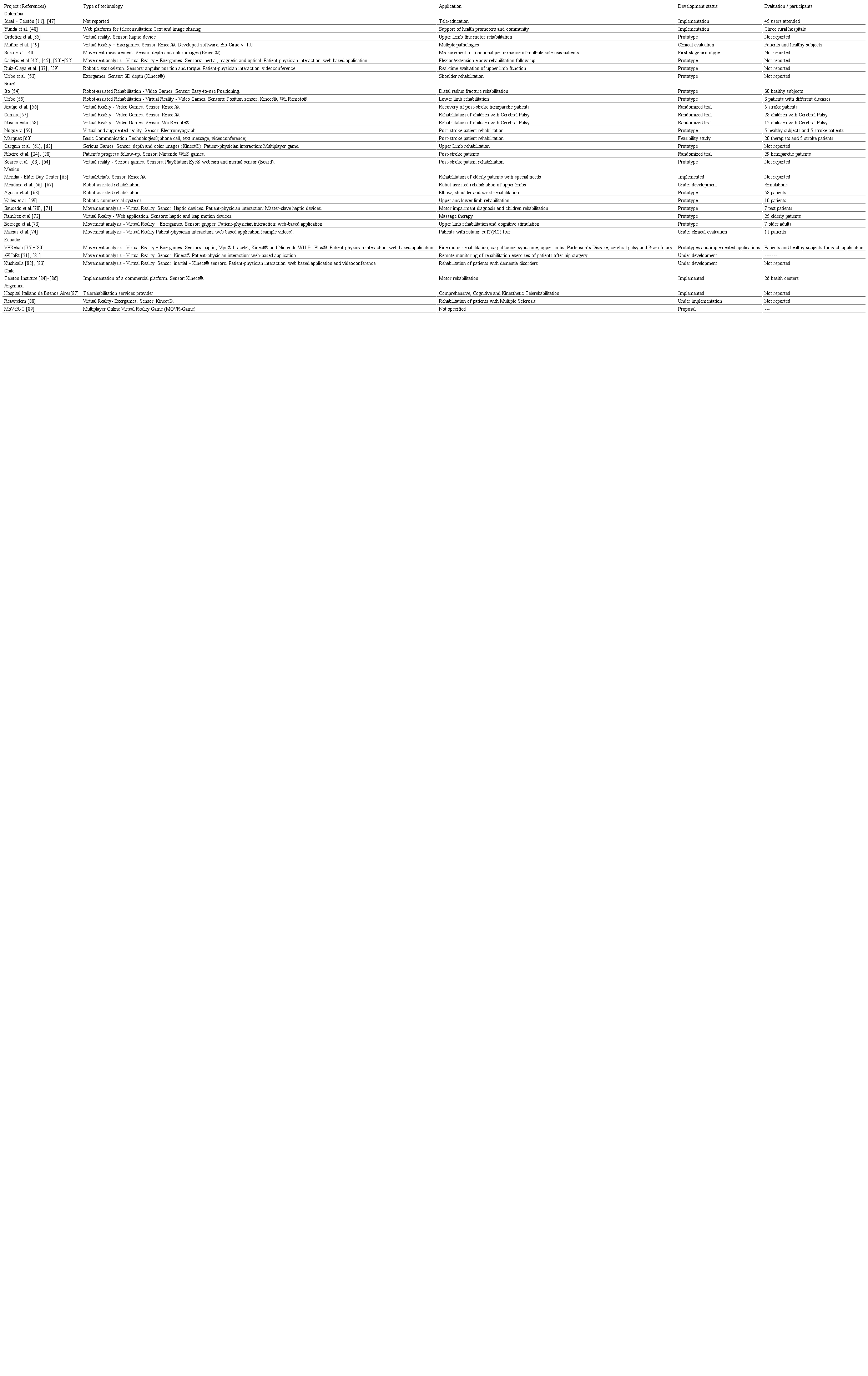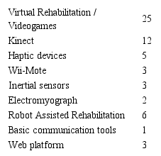 The selected studies were classified by country and project, as the results of our eligibility process. In addition, the review allowed to determine that some documents had been written by the same authors (or some of them) and they were the outcomes of the same projects that also described their use and applied technology. Table 1 presents a summary of the technologies used in those projects. It can be observed that a large number of studies reported the development or use of virtual rehabilitation technologies (25) compared to robot-assisted rehabilitation (6), web platforms (3) and basic communication tools (1). Likewise, the Kinect® depth camera was the most widely used sensor for interacting with virtual environments, which was an expected result because it allows patients to move freely. Furthermore, Table 2 describes the most relevant aspects of the selected studies grouped by projects. It can be seen that a reduced number of the selected studies reported a clinical evaluation of real patients.