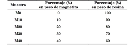 En la Tabla 1 se presentan las mezclas con porcentaje en peso para la conformación de las probetas, donde la fase mayoritaria fue la resina y la minoritaria los polvos de magnetita. La preparación de las muestras se realizó de forma manual, para lo cual se depositó la resina en un recipiente de aluminio; posteriormente se agregaron los polvos de magnetita, y se mezclaron mediante el agitador de cabezal DLAB modelo OS20-S, a 200 r.p.m. por un tiempo de diez minutos; luego se adicionó el catalizador, manteniendo el mezclado por dos minutos más, y por último se depositó manualmente la mezcla en los moldes respectivos, a los que previamente se les había aplicado alcohol polivinílico líquido como desmoldante.