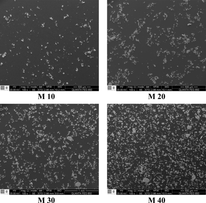 En la Fig. 1 se presentan resultados de microscopía electrónica de barrido, en imágenes de la superficie de las muestras M10, M20, M30 y M40, para una magnificación de 100X con el sensor de electrones secundarios provenientes de las mismas muestras, ya que son emitidos durante procesos de colisiones inelásticas.