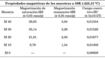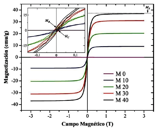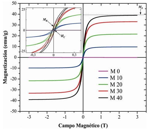 De acuerdo con la literatura (ver Demir et al. [20] y Gu et al. [22]), a temperatura ambiente la magnetita se considera un material superparamagnético, con un valor de campo coercitivo y de magnetización remanente cercano a cero (además de una elevada magnetización de saturación), lo que posibilita su uso en aplicaciones biomédicas como la entrega localizada de medicamentos. Este comportamiento superparamagnético es evidente en las curvas tomadas a una T=300 K (Fig. 5), donde se aprecia notoriamente la reducción en la histéresis presentada por el material de estudio como respuesta al estímulo provocado por la aplicación del campo, reportando un declive sustancial en los valores de HC y MR. Para verlo más claramente, se puede comparar el resultado obtenido para M40 (40 % en peso de Fe3O4) a T=300 K con un HC=0,00501 T y MR=2,51 emu/g, con el observado para T=50 K, donde la misma muestra adquiere un HC=0,01334 T y MR=3,94 emu/g. A su vez, presenta características tales como curvas de histéresis estrechas con bajos campos coercitivos, alta saturación (alrededor de 80 emu/g) [27]–[29], altas permeabilidades magnéticas y temperaturas de Curie típicas de los materiales ferromagnéticamente blandos [30], baja coercitividad (menor a 0,5 T) y que se utilizan como materiales para el almacenamiento de energía o información [31] y sensores [32], entre otras aplicaciones. Por otra parte, las coercitividades presentadas a la temperatura de 50 K (-223,15 °C), donde T<TV, son características de los materiales ferromagnéticos duros, ya que poseen una coercitividad superior a 0,01 T y se consideran como imanes permanentes. También pueden emplearse como memorias magnéticas y para el almacenamiento de energía [33].