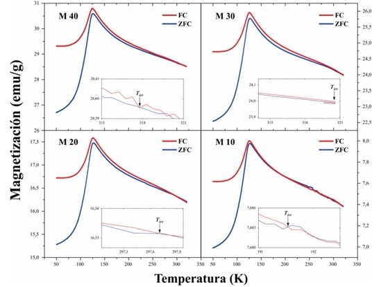 En la Fig. 7 se ejemplifica el comportamiento de la magnetización en función de la temperatura para todas las muestras, en un rango de temperatura entre los 50 K y los 320 K, siguiendo los procedimientos ZFC y FC. En las mediciones ZFC, se enfría la muestra hasta 50 K en ausencia del campo magnético externo; posteriormente se registra la magnetización a medida que aumenta la temperatura en presencia de un campo magnético aplicado de 0,2 T. Por otro lado, en las mediciones FC, se aplica una intensidad de campo magnético constante de 0,2 T, midiendo la respuesta magnética mientras la muestra se enfría hasta los 50 K.