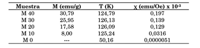 Los resultados reportados en la Tabla 7 sugieren un incremento en la magnetización y en la susceptibilidad magnética de las muestras a medida que aumenta el porcentaje en peso de la magnetita. Este comportamiento es similar al presentado en las curvas de histéresis magnéticas, siendo la muestra M40 (40 % en peso de Fe3O4) la que reportó mayor M y mayor χ, mientras que los menores valores corresponden a las muestras M10 (10 % en peso de Fe3O4) y M0 (100 % de resina). También se puede apreciar que las muestras alcanzan el valor máximo de M sobre los 126 K, en razón del efecto resistivo producido por la matriz polimérica de la resina de poliéster que dificulta el alineamiento de los momentos magnéticos de las partículas de magnetita al exponerse al estímulo de un campo magnético externo [7], [16]. Tras alcanzar el valor máximo, la magnetización decrece tenuemente, pero esta vez no es debido a una transición de fase estructural sino a las fluctuaciones térmicas de los momentos magnéticos del material. Se espera que esta tendencia continúe hasta la temperatura de Curie de la magnetita: TC≈853 K [35], temperatura a la que desaparecen los estados de magnetización espontánea porque la energía térmica destruye las fuerzas de acoplamiento de espín y la magnetita se torna completamente paramagnética.