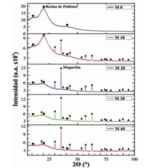 Los patrones de difracción para cada una de las muestras se presentan en la Fig. 3, donde se observa que a medida que la concentración de magnetita se incrementa en la muestra, la reflexión de mayor intensidad (2=35,439°) correspondiente a la magnetita aumenta, mientras que la correspondiente a la fase de la resina de poliéster (2