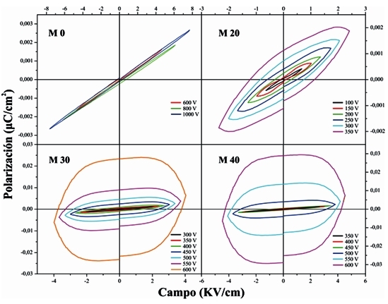 Fuente: autores.En la Fig. 4 se presentan las gráficas de polarización eléctrica en función del campo eléctrico aplicado para las muestras M0, M20, M30 y M40 respectivamente. En dicha figura se observan las curvas de histéresis producidas al aplicar una señal triangular bipolar con un período de 50 ms, donde se aprecia el efecto de la concentración de magnetita en la polarización eléctrica del material compuesto. El comportamiento observado para la muestra M0 es típico de un condensador lineal y se debe al carácter dieléctrico de la resina. Para la muestra M20 la respuesta es característica de un condensador y resistencia en paralelo, correspondiente a un dieléctrico con pérdidas, debido a la mezcla del material dieléctrico de la resina con el material conductor y resistivo de la magnetita. Finalmente, las muestras M30 y M40 evidencian una característica más resistiva en razón del contenido sustancial de magnetita conductora [9].