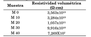 En la Tabla 4 se aprecia una clara influencia del aumento de la concentración de magnetita en la resistividad volumétrica del material: se observa una significante caída de hasta seis órdenes de magnitud, al pasar de x1013 Ω-cm para las muestras M0 a valores de x107 Ω-cm para la muestra M40. Lo anterior indica que la resistividad volumétrica disminuye con el incremento en la concentración de partículas de magnetita. Cuando la concentración de magnetita alcance el umbral de percolación [12], habrá una red conductora en la matriz polimérica y, por consiguiente, una enorme disminución en la resistividad volumétrica, que se observa en la muestra M40.