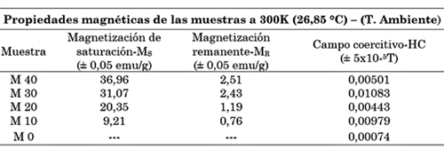 Las Fig. 5 y 6 evidencian que, a pesar de la poca correlación entre el campo coercitivo y la concentración de Fe3O4 en las muestras, el cambio en la temperatura influencia fuertemente la respuesta magnética, produciendo un gradual descenso de los valores del HC con el aumento de la temperatura (HC50K > HC300K). En la Tabla 5, para una T=300 K se observa que el valor del campo coercitivo para M10 y M30 duplica aproximadamente este valor para M20 y M40. Este comportamiento, independiente del porcentaje en peso de Fe3O4 presente en la muestra, es semejante al reportado en la literatura [18]-[19] y ha sido atribuido al tamaño de las partículas y al carácter aleatorio de su orientación en todo el volumen del material [17], donde es bien conocido que el tamaño, la morfología superficial y la estructura cristalina de las partículas que conforman un material, así como por las alteraciones en el entramado tridimensional de las muestras, influyen fuertemente en sus propiedades magnéticas, ya que los defectos estructurales y el tamaño finito pueden dar lugar a diferencias en los valores de los parámetros magnéticos [23]. Por otro lado, la energía térmica juega un papel determinante sobre la inestabilidad de los dominios magnéticos en el interior de las partículas de un material, razón por la cual esta aparente anomalía es notoria a temperatura ambiente (y en general a altas temperaturas), ya que la agitación térmica magnifica los efectos de fluctuaciones en las superficies finitas [24].