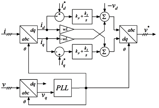 Una técnica de control de corriente es la aplicación del control orientado en el marco de referencia dq. En su implementación se requiere un lazo de enganche de fase o Phase Locked Loop (PLL) que determina la posición angular, valor necesario para aplicar la transformación de coordenadas abc/dq y dq/abc. Un análisis detallado de esta transformación y su aplicación en control se expone en [25], [26].